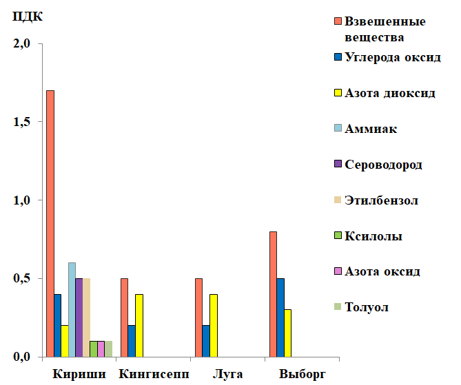 В г. Кириши максимальная концентрация взвешенных веществ превысила ПДКм.р. в 1,7 раза (СИ – 1,7), значение НП – 1,3 %. Максимальные концентрации диоксида серы, диоксида азота, оксида азота, оксида углерода, сероводорода, аммиака, бензола, толуола, ксилолов и этилбензола не превышали ПДКм.р. В целом по городу средние за месяц концентрации взвешенных веществ, диоксида серы, диоксида азота, оксида углерода, аммиака, бензола составляли менее 1 ПДКс.с. Уровень загрязнения квалифицируется как повышенный.
