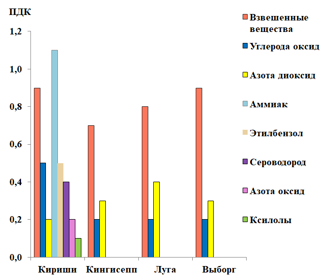 В г. Кириши максимальная концентрация аммиака превысила ПДКм.р. в 1,1 раза (СИ – 1,1), значение НП – 1 %. Максимальные концентрации взвешенных веществ, диоксида серы, диоксида азота, оксида азота, оксида углерода, сероводорода, бензола, толуола, ксилолов и этилбензола не превышали ПДКм.р. В целом по городу средние за месяц концентрации взвешенных веществ, диоксида серы, диоксида азота, оксида углерода, аммиака, бензола составляли менее 1 ПДКс.с. Уровень загрязнения квалифицируется как повышенный.