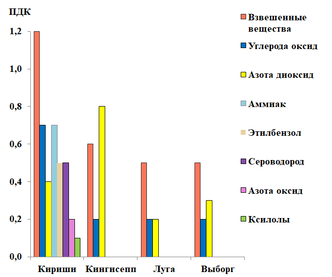В г. Кириши максимальная концентрация взвешенных веществ превысила ПДКм.р. в 1,2 раза (СИ – 1,2), значение НП – 1,2 %. Максимальные концентрации диоксида серы, диоксида азота, оксида азота, оксида углерода, сероводорода, аммиака, бензола, толуола, ксилолов и этилбензола не превышали ПДКм.р. В целом по городу средние за месяц концентрации взвешенных веществ, диоксида серы, диоксида азота, оксида углерода, аммиака, бензола составляли менее 1 ПДКс.с. Уровень загрязнения квалифицируется как повышенный.