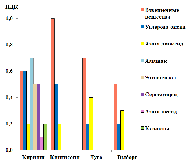 В г. Кириши максимальные концентрации взвешенных веществ, диоксида серы, диоксида азота, оксида азота, оксида углерода сероводорода, аммиака, бензола, толуола, ксилолов и этилбензола составили не более 0,7 ПДКм.р. В целом по городу средние за месяц концентрации взвешенных веществ, диоксида серы, диоксида азота, оксида углерода, аммиака, бензола составляли менее 1 ПДКс.с.