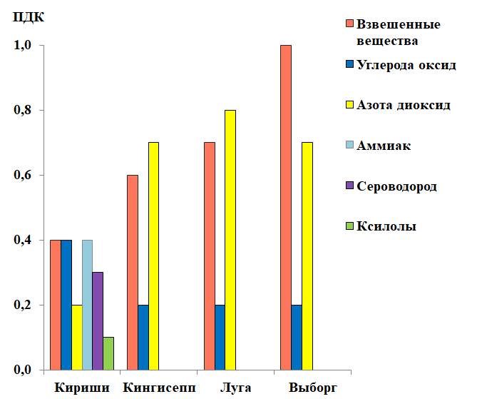 В г. Кириши максимальные концентрации взвешенных веществ, диоксида серы, диоксида азота, оксида азота, оксида углерода сероводорода, аммиака, бензола, толуола, ксилолов и этилбензола составили меньше ПДКм.р. В целом по городу средние за месяц концентрации взвешенных веществ, диоксида серы, диоксида азота, оксида углерода, аммиака, бензола составляли менее 1 ПДКс.с.