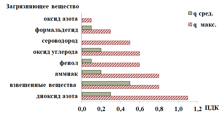В целом по городу средние за месяц концентрации взвешенных веществ, диоксида азота, аммиака, формальдегида, хлористого водорода, оксида углерода, фенола и диоксида серы были менее 1 ПДКс.с.