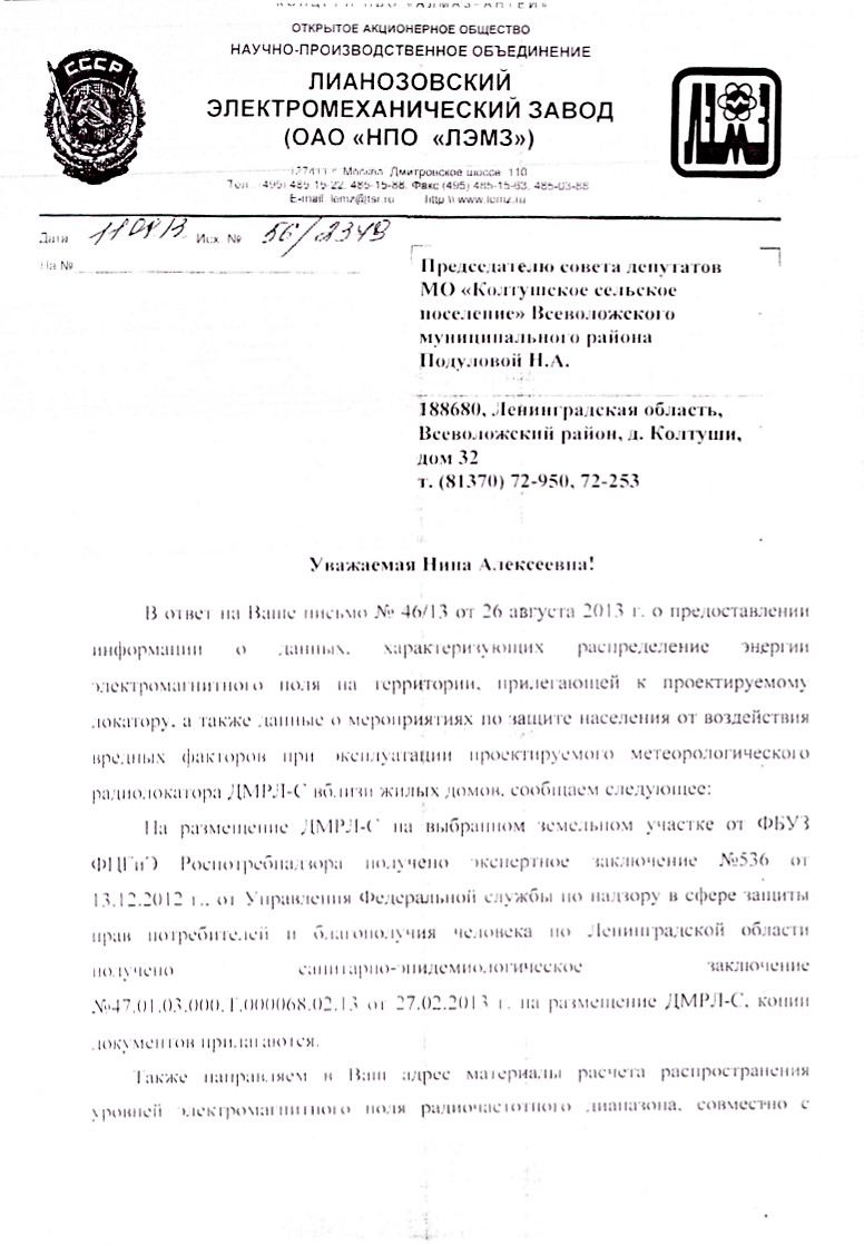 По многочисленным обращениям граждан по вопросу размещения в п. Воейково Всеволожского района Ленинградской области доплеровского метеорологического радиолокатора ДМРЛ-С размещаем официальное санитарно-эпидемиологическое заключение Федеральной службы по надзору в сфере защиты прав потребителей и благополучия человека № 47.01.03.000.Т.000068.02.13 от 27.02.2013 г.