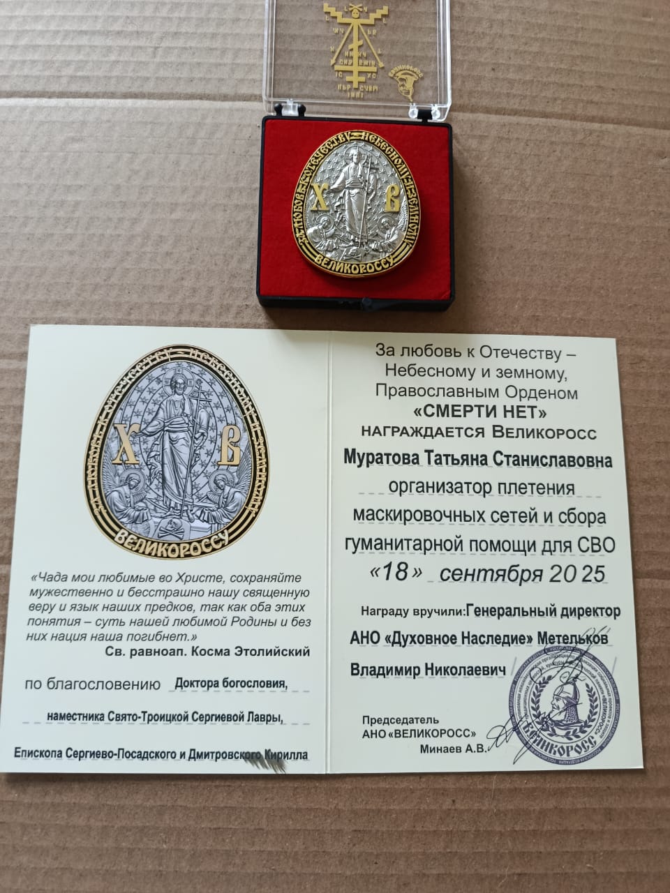 18.09.2025 Автономная некоммерческая организация поддержки социальных, патриотических, духовно-просветительских и культурных проектов «Духовное Наследие» наградила православным орденом «Смерти нет» техника-аэролога 1 категории аэрологической станции Воейково Татьяну Муратову за организацию плетения маскировочных сетей и сбора гуманитарной помощи для СВО.