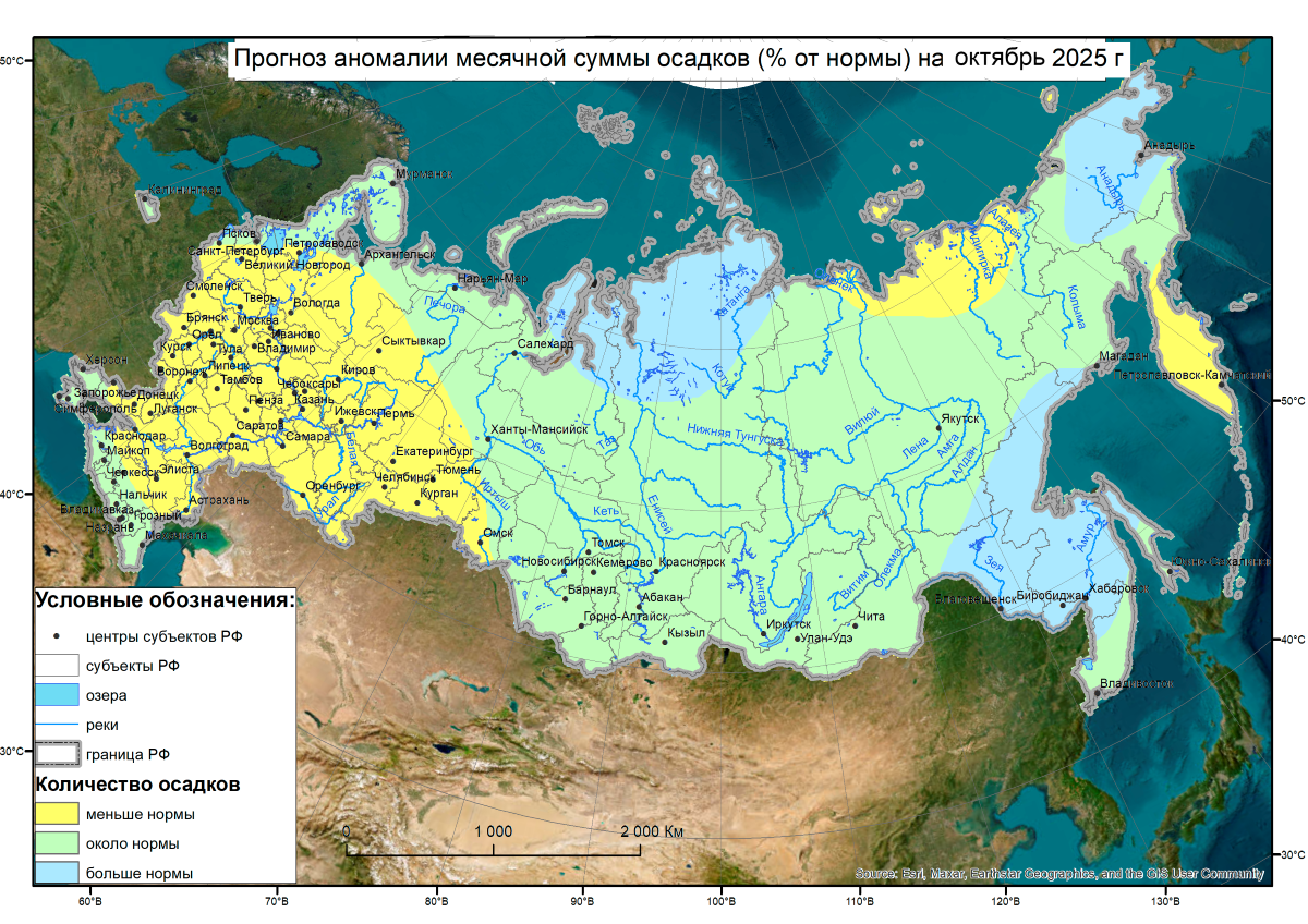 Месячное количество осадков предполагается на севере и западе Северо-Западного федерального округа, на юге Южного федерального округа и СевероКавказского федерального округа близким к норме; на остальной территории меньше.