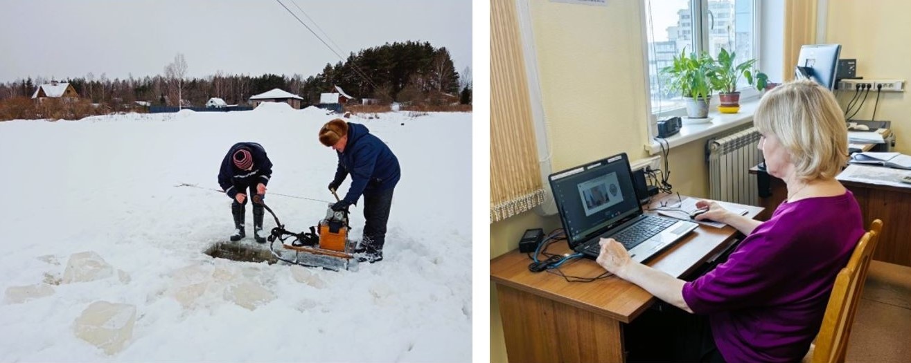 Первый этап КШУ 11.03.2026: слева – проведение гидрологических наблюдений на ГП Пятоново – р. Великая (Псковский ЦГМС), справа – участие в заседании постоянно действующей рабочей группы КЧС Республики Карелия в режиме видеоконференцсвязи (Карельский ЦГМС)